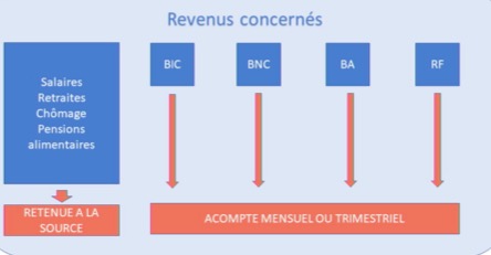 C’est au contribuable de verser un acompte mensuel ou trimestriel (voir supra) pour les revenus des Bénéfices Industriels et Commerciaux, Bénéfices Non Commerciaux, Bénéfices Agricoles et des Revenus fonciers car ils ne sont pas retenus à la source. Attention à ne pas sous estimer ces acomptes. Ces acomptes dépendent des revenus en 2017. Cela pourrait entrainer une pénalité. Une certaine tolérance serait néanmoins accordée en 2019.